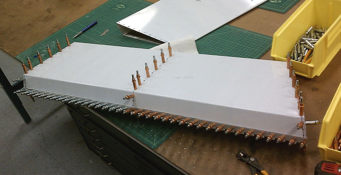 working on the elevator, performing a final debur operation on all rivet